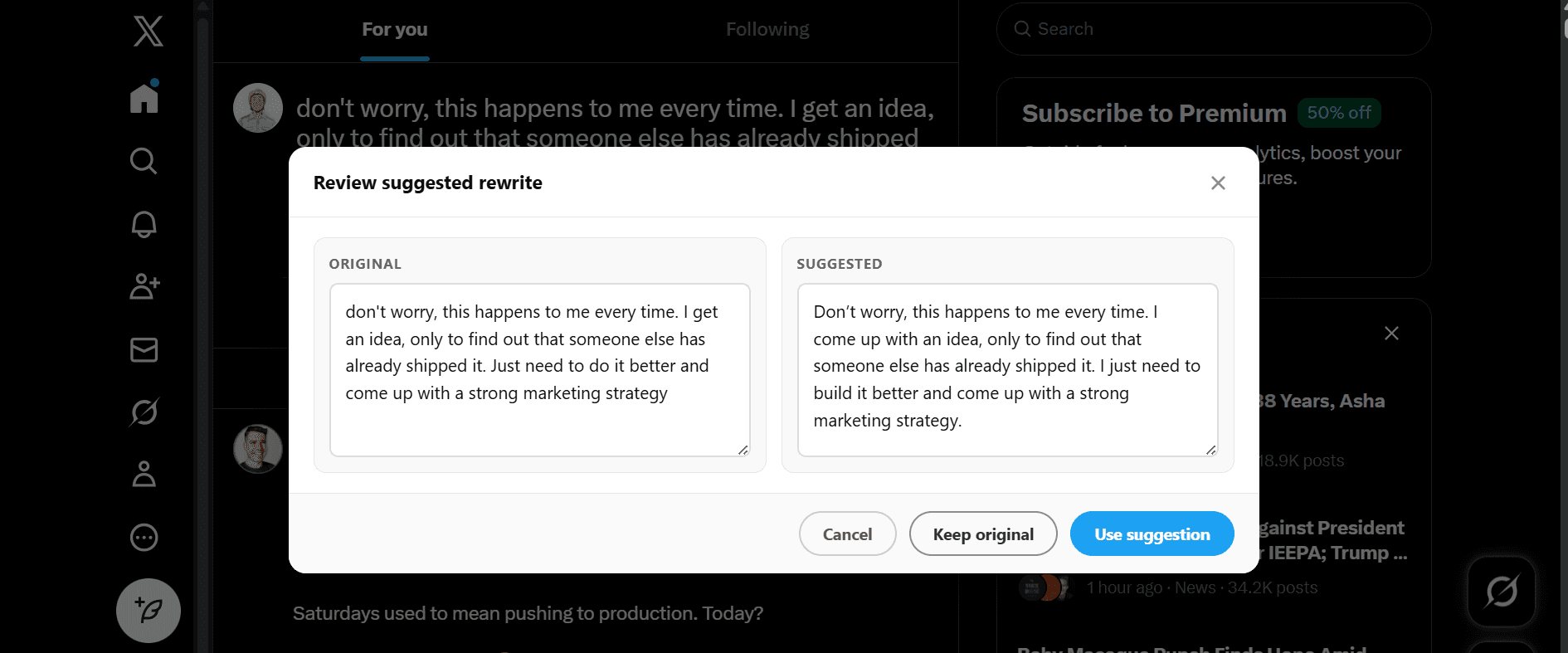 Select any text on YouTube or X and rewrite it in polished English with a single click.